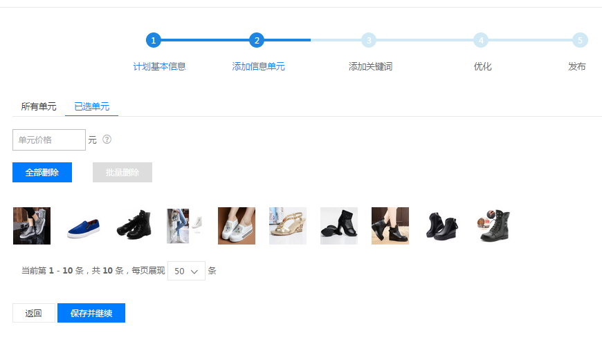 自助推广分为五步:计划基本信息、添加信息单元、添加关键词、优化、发布。