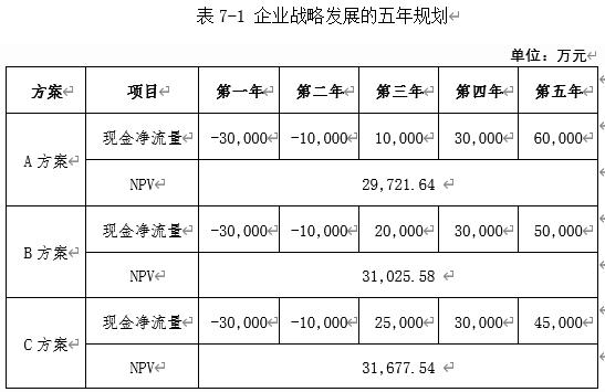 以Y企业为例,其五年规划目标是实现10亿元的收入。为实现这一目标,企业需要投入4亿元用于厂房和设备的更新。通过评估不同方案的NPV(净现值),管理者可以选择最优的投资路径。如表7-1所示,C方案的NPV净现值为31,677.54万元,成为管理者的首选。