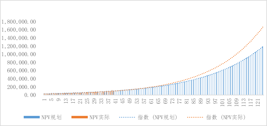企业达成的类型选择应根据企业的发展路线和配置条件来确定,而企业在不同的发展周期中,所需的达成类型也会有所不同。尽管企业所处的外部环境相同,但管理者可以根据自身企业的发展逻辑来模拟百年发展趋势预测图,这代表了企业的发展路线。例如,通过图7-2,我们可以预测企业的百年发展趋势。图中蓝线代表企业NPV规划的发展曲线,红线则代表企业NPV实际的变化。企业已经实际运作了40年,根据这40年的指数预测分析,企业的实际发展趋势表现良好,如果按照这样的趋势发展下去,企业有望实现百年发展目标。