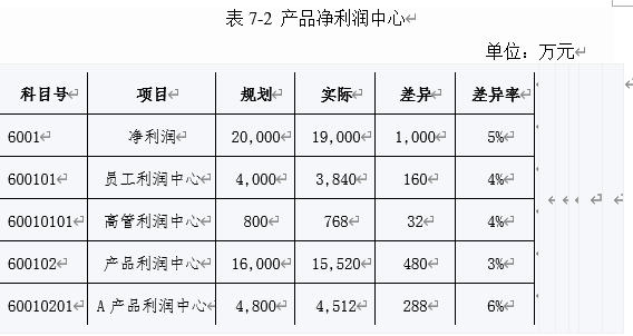 净利润作为一级指标,主要由二级指标员工利润中心和产品利润中心构成。员工利润中心则包括三级指标高管利润中心和其他员工利润中心,而产品利润中心则包含三级指标如A产品利润中心等。具体的评估数据如表7-2所示。