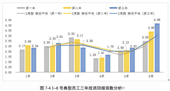 通过对1-6号典型员工三年的投资回报倍数进行分析,可以看出这些员工的投资回报移动平均倍数是上升的,这表明这些员工在过去的三年中为企业带来了较高的回报。