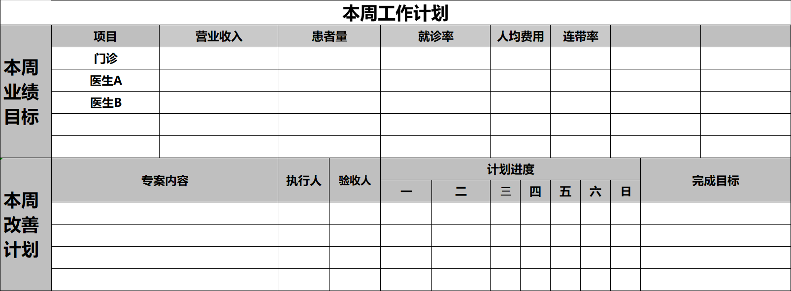 改善专案有两个来源:一是上周总结找到问题要进行的改善;二是为了达成目标主动性的改善。改善计划也要有目标,很多口腔门诊有计划,但是没有完成计划的标准,即改善计划的目标,就无法衡量执行人的达成质量,所有的计划都要有可衡量的结果。当然,在执行前需要有执行标准,这个可能不在周计划表里体现,但是一定要做。