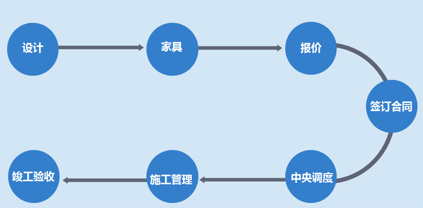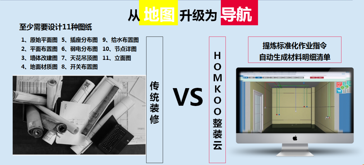 使用HOMKOO整装云赋能平台,装修公司只需完成:获客、施工、安装交费三项工作。