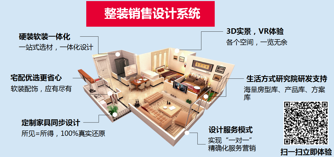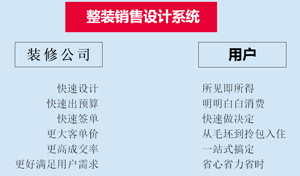将全屋定制企业原本就很强大终端优势,应用到整装销售中。比如成熟的全屋产品方案、急速渲染的设计软件、一键生成的报价系统、3D实景/VR体验的科技手段等等。客单价提高、转化率提升,客户从1到100指数级增长。