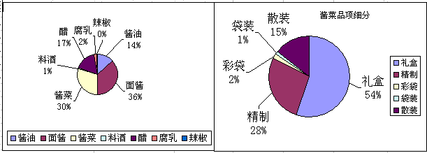 从我们实地考察的情况来分析,XX味业目前生产的产品品类较多,但目前尚无特别突出的产品。以下我们就XX味业的产品,酱菜、酱类、酱油、食醋、腐乳几个大类来一一分析如下,如图2-5所示。