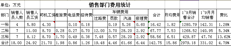 表2-1:XX味业2006年1-9月份销售部三个部门费用综合占比