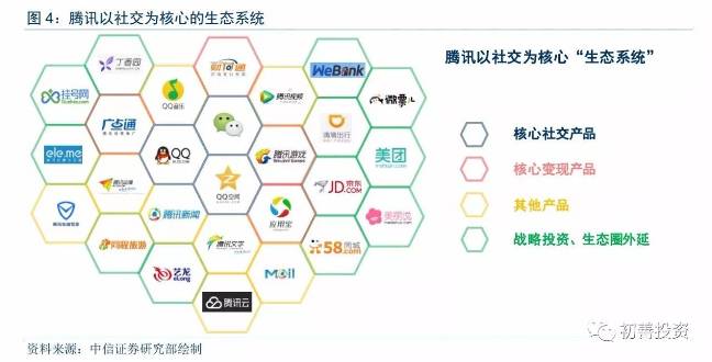 可以看到,因为腾讯的对外投资的外延式发展,腾讯的版图也就成为这幅景象。如笔者前面所说的腾讯的业务是围绕着QQ和微信两个社交平台呈现的聚合态。通过微信和QQ将流量引导至所投资产品,以投资款项和流量扶持原有的业内龙头共赢发展。打破基因决定论宿命和原有行业的发展天花板。如图6-49所示。