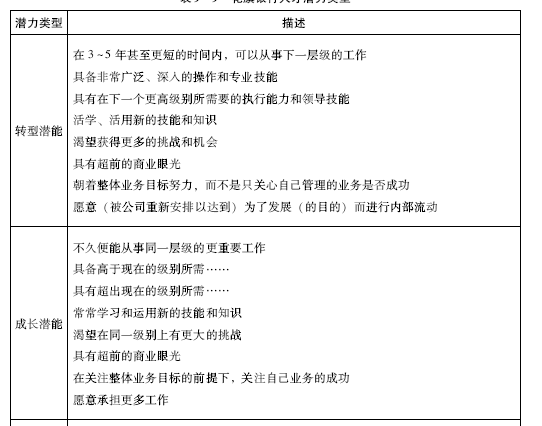 花旗银行人才潜力分为三个等级,分别为转型潜力、成长潜力与熟练潜力三种。如表9-9所示。