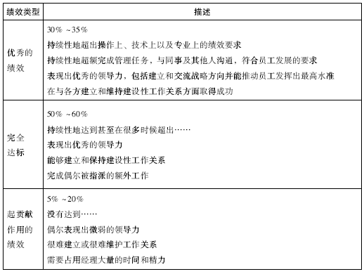 5. (5)绩效完全达标的成长型潜能的员工:有可能在目前的层级承担更多的职责,但是应该努力达到优秀的绩效;在上一年度轮流到新的工作岗位,并且在以前被评在第一种、第二种类型的员工通常也会被纳入此格。