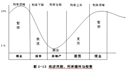 (3)萧条阶段。经济增长停滞,企业生产能力急剧减少降低,大宗商品价格下跌,大量失业,投资减少,信用紧缩,居民消费预期降低,对未来悲观,利率达到谷底,因此,投资于“房地产”是最佳选择。