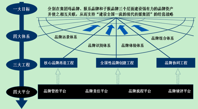 客户的正面评价是咨询价值的最好体现之一。纵观整个品牌战略咨询过程,我们没有给客户提供什么绚丽的品牌演绎和精彩的传播创意,我们给客户提供的是完整的集团品牌战略体系、管理架构和系统完善的导入和实施方案。事实上,为了保证项目的系统性和完整性,在品牌规划的最初阶段,我们就根据浙报集团本次咨询的目的和特点,设计了“一大目标、四大体系、三大工程、四大平台”的总体品牌战略纲领(如图6-3所示)。