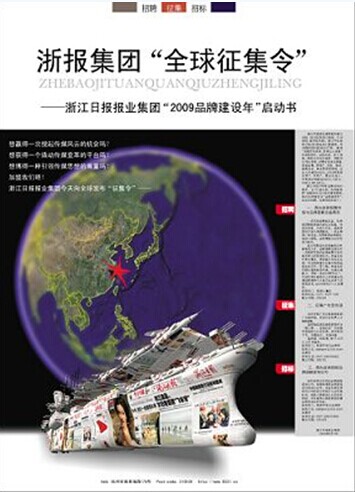 时间回放到200921日,一封张扬而略显奇特的“全球征集令”出现在《浙江日报》的报端(如图6-2所示),而它的发出者正是《浙江日报》的主人——浙江日报报业集团(下简称浙报集团)。征集令一共三项内容,其中一项就是面向全球征集品牌战略咨询公司,为“打造中国一流传媒集团”进行品牌战略咨询。全国各大媒体和网站纷纷转载和热议,征集令的消息迅速扩散,浙报集团要实施品牌战略的消息迅速成为轰动传媒行业的重大事件。