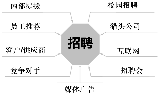 以下几个渠道可供选择,分别是内部选拔、员工推荐、客户/供应商、竞争对手、校园招聘、猎头公司、互联网、招聘会、媒体广告,这九种渠道各有利弊,我们将对前五种渠道做重点分析。