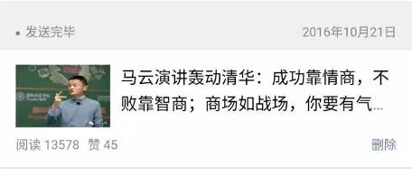 我们先看第一个案例,《马云演讲轰动清华。成功靠情商,不败靠智商,商场如战场,你要有气场》是我们改的标题,这里面增加了两个IP,一个是马云,一个是清华,这两个都是具有吸引力的,虽然这两个IP没有形成反差,是正向的关系,但是同样会引起关注。