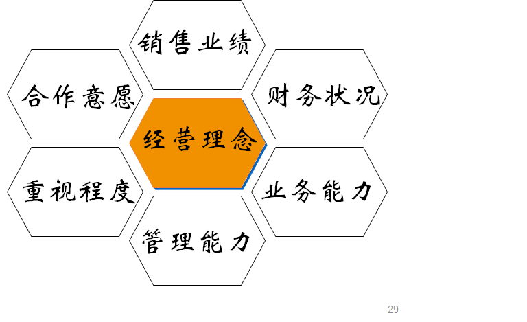 合作意愿通俗地讲就是女孩子爱不爱你,爱得死去活来非你不嫁,还是若即若离,或者完全不答应。经销商的合作意愿有几个层次:合作意愿很强烈,相见恨晚;合作意愿一般,左右摇摆,拿不定主意,也许有几个供应商在谈,或对现有的厂家不太满意;谈来谈去遥遥无期也不明确拒绝;或者直接拒绝合作,你落花有意,他流水无情。现实情况是,有意愿的渠道成员不符合要求,而符合要求的渠道成员没意愿或意愿不强烈。