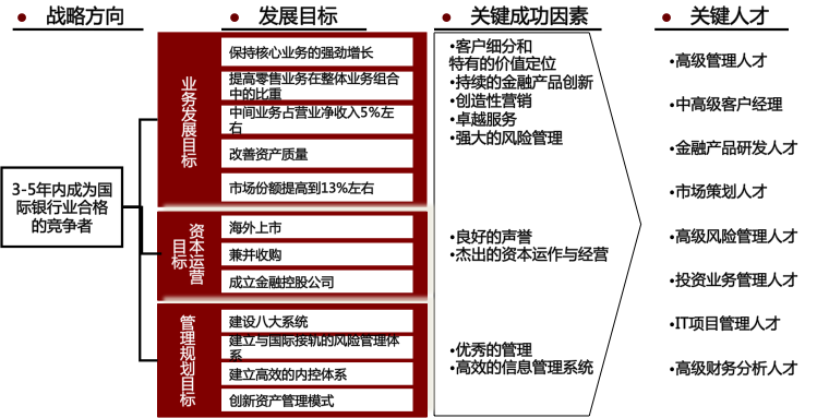 如图3-1所示,我们服务过的某家银行在做人才界定的时候,从战略方向着手,根据业务及管理现状,将战略方向确定为发展目标,进而分析达成发展目标所需的关键成功因素,以及由此确定的关键人才。