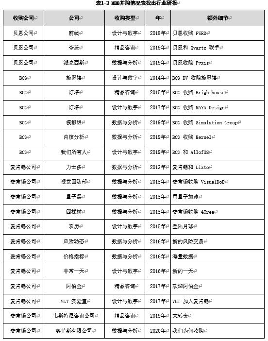 管理咨询行业的并购主要是收购涉及数字类的跨界机构和中小型精品同类咨询公司。“MBB”(即麦肯锡、贝恩、波士顿公司)等领先管理咨询公司的收购动力,除了获取新的能力、新区域业务快速增长或短期内获取专业知识外,更重要的是利用新能力,以加速自己对新商业环境的认知与理解。该类收购的顶尖人才将会成为能力领导者,授权其管理内部团队和负责外部市场扩张。同时,“MBB”通过自身管理咨询服务运营管理模式来变现新收购的专业能力,释放其与客户交互能力的潜在价值。
