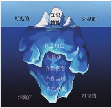 Spencer把胜任特征描述为在水面漂浮的一座冰山。水上部分代表表层的特征,如知识、技能等;水下部分代表深层的胜任特征,如社会角色、自我概念、特质和动机等。