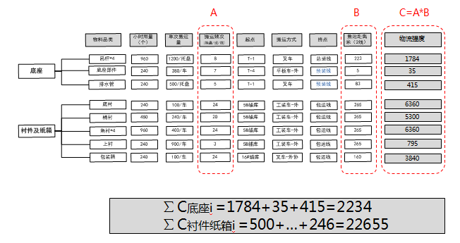 第二步:计算零件的搬运距离:然后用托盘数*搬运距离就得到物流强度。计算结果如图7-6所示,