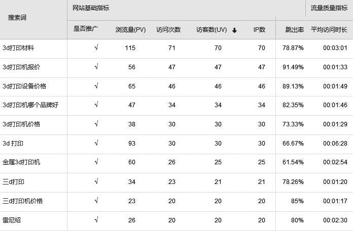 在百度统计系统中,除了【实时访客】,另一个我最喜欢使用的工具就是【搜索词】。图6-4就是一家3D打印机经销商的一个月部分搜索词数据。对于每天有500个访客光顾的这家3D打印机网站,很难做到每条数据都解读,也很难发现那种更聪明的恶意点击(这些恶意点击者本着放长线钓大鱼的策略,平均每天针对一个网站点1~2次。如果只看当天的数据,不管是百度还是广告主都很难察觉),但我们做30天的累积数据,就比较容易发现问题。在图6-4的几个搜索词:3d打印机报价、3d打印设备价格”“3d打印机价格”,有普遍的规律:跳出率高、平均访问时长短。这几个词被怀疑恶意点击的可能性大,如果结合搜索推广的【搜索词报告】,以及对比实际咨询客户所对应的搜索词,能够更准确地判定恶意点击。