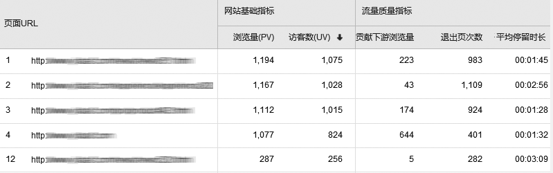 图6-9的第4行是网站首页,共有1077浏览量,824名访客,贡献下游浏览量最多达到644条,直接退出首页的有401次,平均访问时长是1分32秒,就是因为首页的内容非常多,所以贡献下游浏览量比较大。以这条数据为基准,第五行数据比较有特点,虽然只有287次浏览量256个访客,但访问时长达到最多3分9秒,贡献下游浏览量只有5次。说明该网页内容比较受某些人群的喜爱,但网页导流到其他页面的内链比较少,可以适当在网页底部增加些相关链接导向其他重要页面上。第3行数据访问时长偏少,检查页面后发现该网页是个过了期的活动页面,可更换成新的活动页面来吸引访客。