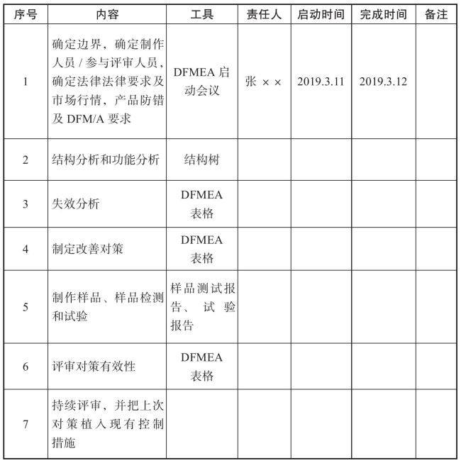 制作计划前,先要组建好DFMEA团队,团队协调员是工程技术部的项目负责人。核心团队成员:电子工程师、软件工程师、包装工程师、结构工程师,负责DFMEA的制作、改善对策制定。扩展团队成员:生产和品质代表、采购和销售代表、测量工程师、其他研发人员,扩展团队成员参与DFMEA的评审及DFMEA改善措施的落实。