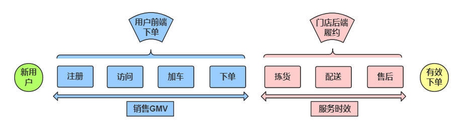 我们先假设一个新用户首次进入平台后的理想购物流程,从前端销售到后端履约两个大场景,基于这两个场景来区分行为数据,详情见图2-1,归纳目前业务的大部分主流数据维度。