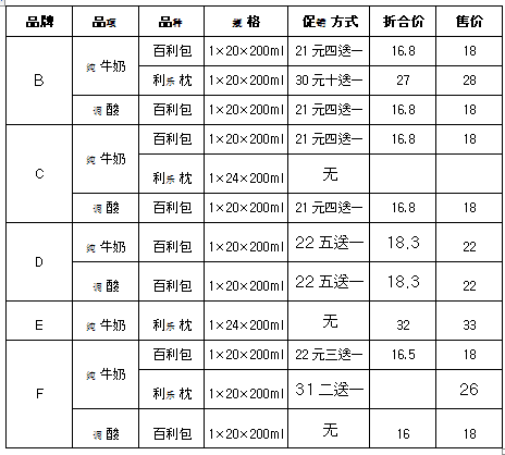 (2)果味酸奶目前执行“七送一”政策,按目前经销商普遍发货价16元计算,毛利空间3元/件,这也是对特级纯牛奶推广积极性不高的原因。