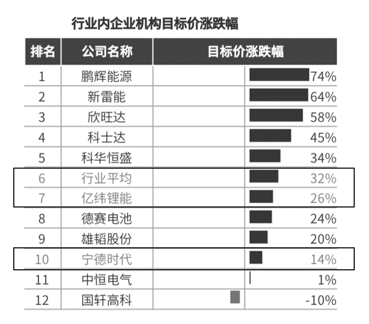 以宁德时代为例,目标价涨跌幅为14%,明显低于行业平局水平和对标企业。在券商看来,宁德时代的股价已处在较高水平,后续的增长空间有限,这与公司2019年股价的快速上涨有关,股价经历了2019年的快速上涨,已接近券商给出的目标值。如表9-1所示。