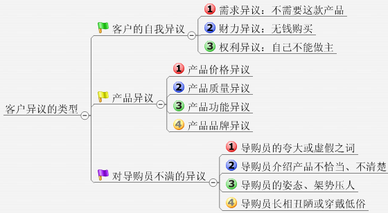 在销售的过程中,从接待到成交,甚至成交之后,客户都会提出异议。可以说顾客拒绝是销售的一种常态。缺乏耐心的导购员不了解这一点,常常认为:顾客进店不是来对抗的就是来砍价的。而优秀的导购员不会惧怕客户的拒绝,只会理性分析顾客拒绝的原因,并拿出处理异议的办法。总的来说,客户拒绝的原因有三个方面,每一方面又有一些细分,见下图。