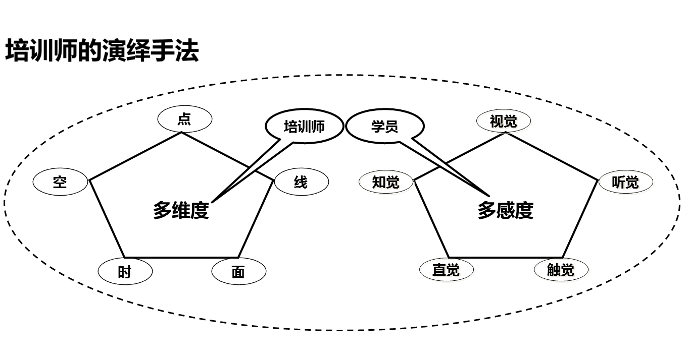 从表面上看,学员似乎只是在“听”课程内容,但实际上,学员恰恰是通过“看、听、问、做、思”等多种感知功能,去“判读、理解、消化、体会、领悟”课程内容。为此,在“演绎手法”上,作者提出两个说法,即是“多感度”和“多维度”。