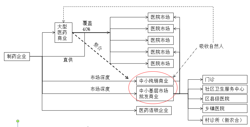 经过政策压力形成的制药企业新的渠道结构中,渠道专业化分工日益明显,大型医药商业负责物流、资金、配送,盘踞在各地域的纯销商业负责终端的维护、上量。
