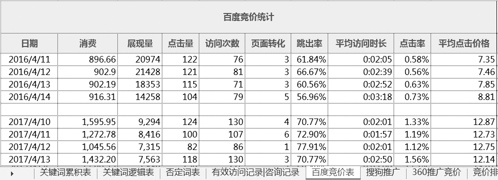 注解:该表需要每天把百度搜索推广中的数据报表信息复制、粘贴到此,看似无用,但可以提醒网络营销人员关注这些数字的变化,这些数据的日积月累就成了企业网络营销的大数据,对比每行数据就能发现问题。我正是查阅了大量客户的竞价统计表,才发现在魏则西事件后,搜索推广的跳失率提高、平均访问时长减少,预示着恶意点击比以前多了,而点击率提高了一倍,平均点击价格提高了50%,所以每天消费也提高了50%。表7-5是2016年4月4天的数据与2017年同期数据对比。正是带着对点击率的疑问,我做了深入研究,才发现恶意点击主要来自网盟广告,它也是点击率普遍提高的真正原因。