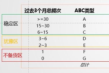 3个月内需求频次在2-6的配件处于“犹豫区”,这区间的配件需求不稳定,可能出现连续几个月没有需求,在某一个月需求却突然增多的情况,对处于“犹豫区”配件,需要根据数据与经验确定适当库存量,保证既能满足不时之需又能很好地控制呆滞情况的发生。