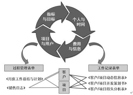 当前,我国工业企业的过程管理还比较薄弱,重结果、轻过程。没有过程管理,就没有真正意义上的战略共识和策略指导,营销系统就会陷入业务协同难、目标达成难、战略落地难等困境。我们提倡营销过程管理的“四合一”,即指标与目标合一、时间与个人合一、信息与费用合一、项目与用户合一。营销过程管理信息化可以通过两类表单实现,一是过程管理表单,如《月度工作总结与计划》和《销售日志》;二是工作表单,如《客户动态信息表》、《项目动态信息表》。使用这些表单可以帮助我们实现互联互通、信息共享、实时提醒、统计分析等,如下图所示。