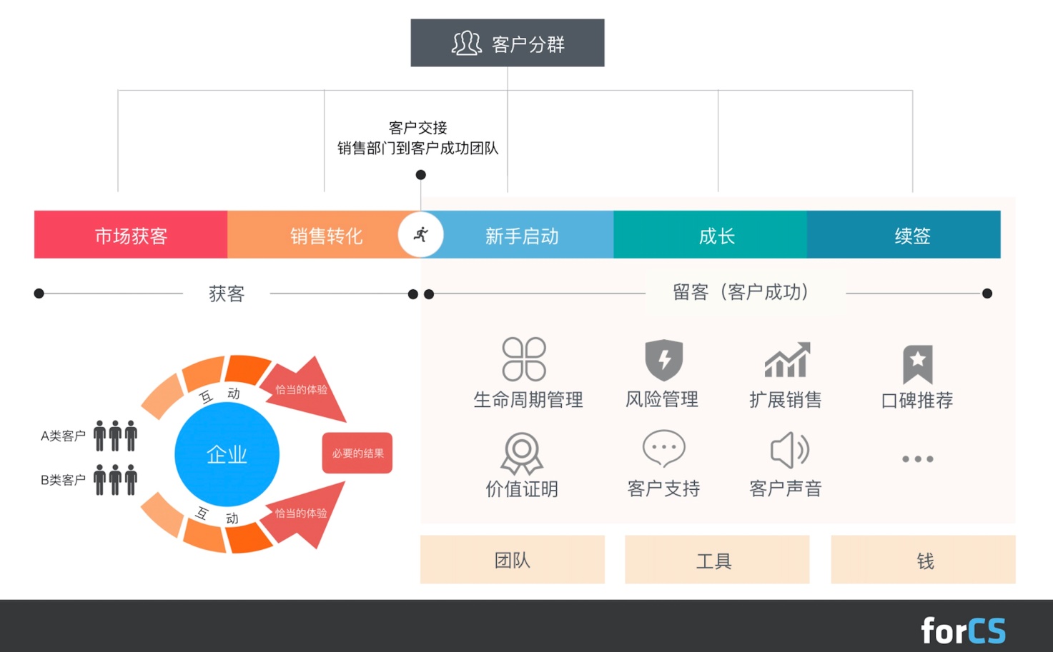 客户生命周期分为5个阶段:市场获客、销售转化、新手启动、成长、续签。