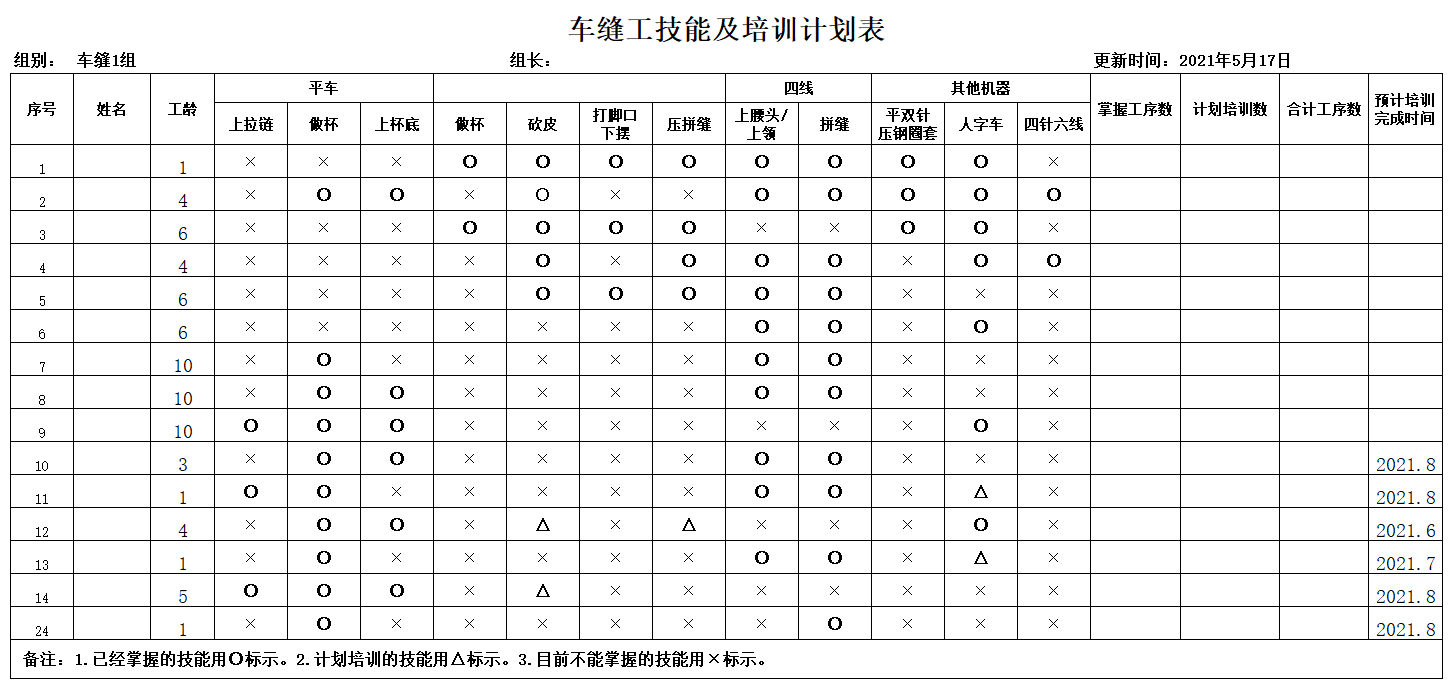 为了系统地快速地培育多能工,必须对多能工的培训拟定培训计划,有针对性的开展培训。培训计划表必须包括以下要素:姓名、工龄、所有工序名称、目前掌握的工序数量、计划培训的工序数量、计划培训的时间。