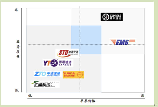 在快递市场现有竞争格局上,从单票价格和服务质量来看,顺丰价格高、服务质量好,EMS价格高但服务比不过顺丰。当然这里的服务质量指的是一个综合的概念,包括速度、网络覆盖、标准等,但EMS在网络覆盖上是无人能出其右的。如申通只有8000个网点,而EMS有36000个,所以EMS整体的服务质量是比“三通一达”要高的。“三通一达”基本属于低质低价竞争,当然目前它们也有向顺丰努力靠拢的趋势。