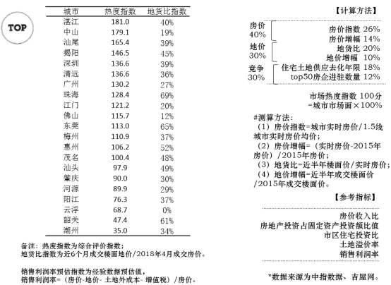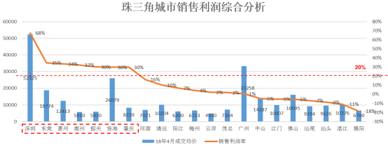 从销售利润率看,大于25%的城市有7个,为深圳、东莞、惠州、潮州、韶关、珠海、肇庆;销售利润率=(房价-地价-土地外成本-增值税)/房价,土地外成本按3600元估算。增值税=(房价-地价)*10%/(1+10%)-3600*8%。需要注意的是:销售价格为2018年4月份价格,楼面价为近6个月成交楼面价,土地外成本按3600元/㎡测算。