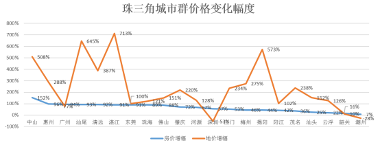 珠三角城市群房价平均涨幅为65%,地价平均涨幅为236%;房价涨幅高于城市群整体平均增幅的城市共有11个,分别为中山、惠州、广州、汕尾、清远、湛江、东莞、珠海、佛山、肇庆、河源;地价涨幅高于城市群整体平均增幅的城市共有7个,分别为中山、惠州、汕尾、清远、湛江、梅州、揭阳、茂名。
