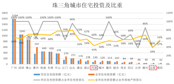 2016年珠三角城市群住宅投资额为6981亿元,住宅投资额在均值235亿元以上的城市有8个,分别为广州、深圳、佛山、惠州、珠海、东莞、中山、江门。整个城市群住宅投资额占房地产投资额比重为58%,市区住宅投资占全市住宅投资的90%。市区住宅投资占比低于50%的城市有:河源、汕尾,以上城市所辖县级城市房地产投资较为活跃,应重点关注。