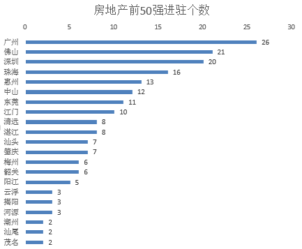 广州、佛山、深圳TOP50房企进驻较多,市场竞争十分激烈;珠海、惠州、中山、东莞、江门已经有10家以上TOP50房企进驻;清远、湛江、汕头、肇庆、梅州、韶关、阳江均有5家以上TOP50房企进驻