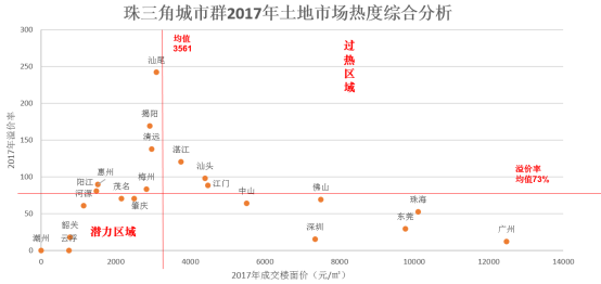 珠三角城市群整体房价中位值为9626元/㎡,地价中位值为3819元/㎡;珠三角城市群地货比中位值为37%。地货比较高的三个城市为江门、汕头、揭阳,应及时捕捉市场信息,防控拿地风险;地货比较低的三个城市为深圳、韶关、潮州,应作为重点关注城市,寻找机会适时进驻。
