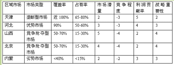 北京市场:市场潜在容量与竞争程度相抵,风险与潜力并重,利润贡献率不大,但作为首都市场,有相当高的战略重要性,可在做品牌和市场表现上下功夫,促进市场稳定发展。