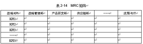 (1)​ MRC 矩阵由战略管理部门或质量运营管理部门主导,绩效管理部门协同参与,通过征求相关业务部门负责人意见,经多方达成共识后输出,如表 2-14所示。