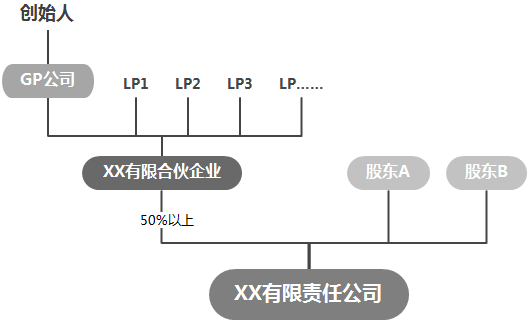 最下面是控制对象,即目标公司。第一层控制主体是有限合伙企业,它控股目标公司。第二层控制主体是GP公司,它作为普通合伙人,控制有限合伙企业,第三层是创始人,它控制GP公司。