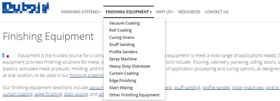 比如下面这个国外公司,做表面涂装设备(finishing equipment)的。这类设备也大多是定制的,真正能确定的分类只有设备所实现的工艺,比如真空涂装(vacuum coating)、辊涂(roll coating)、淋涂(curtain coating)等不同的涂装方式,以及固化(curing)、砂光(sanding)等后处理工序。至于具体的设备,比如都是辊涂机这一类设备,每个公司做出来的设备长相功能都不一样,叫法也是千奇百怪,并没有通用分类。因此,他们的产品列表上也就只按工艺分了一级,如下。