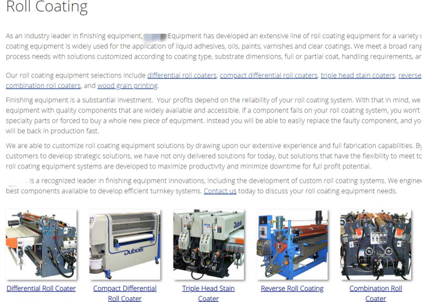 而当我们点开其中“辊涂(roll coating)”这个页面,就会看到他们把这类设备的特点、自己设计和制造辊涂机的优势都先写在了前面,并解释清楚了他们公司实际上是提供定制设备的,各种各样的辊涂机都可以做,底下再展示他们现有的辊涂机型号。