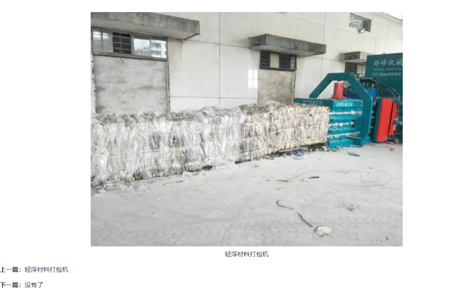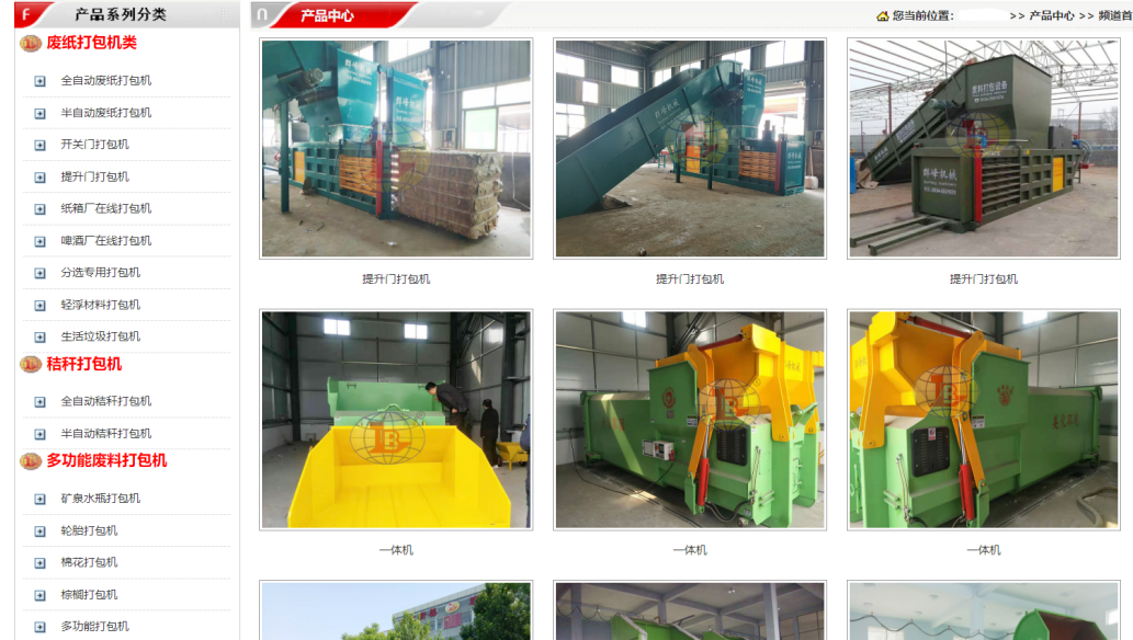 从左侧列表上看,是不是觉得他们家设备种类还挺多的?但实际上,这家公司的打包机就只有两大类——“全自动打包机”和“半自动打包机”,顶多能在下一级再分出采用提升门的或开关门的。至于是用来打包废纸也好,秸秆也好,或是轮胎、棉花、水瓶等等,任何一款打包机都是可以全部适用的,并不存在专门用来打包某类东西的打包机。