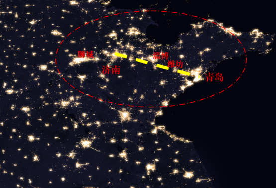 从卫星灯光图中可以看出,在山东半岛城市群中,济南和青岛为中心城市,形成了济南、青岛都市圈,淄博、潍坊等城市沿济青高铁分布。